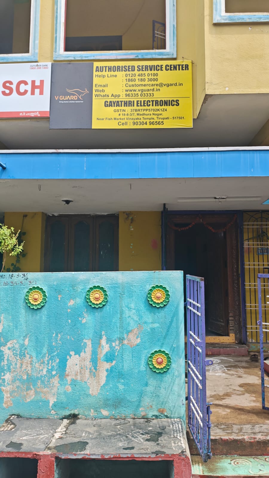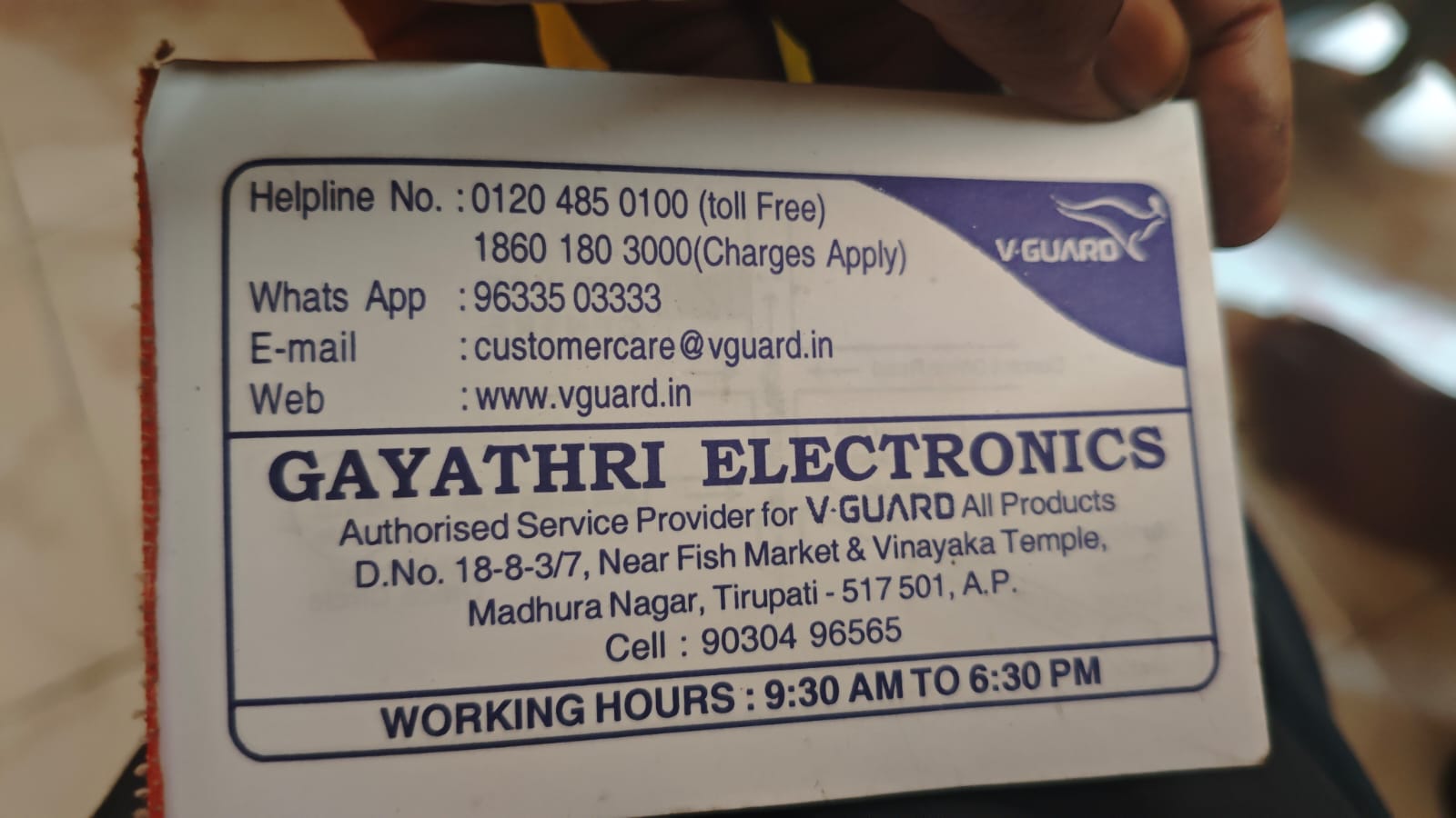 Authorized Service Provider for V-Guard Products πŸ“ Address: D. No. 18-8-3/7, Near Fish Market & Vinayaka Temple, Madhura Nagar, Tirupati – 517 501, Andhra Pradesh. πŸ“ž Contact Numbers: Mobile (Service Center): 90304 96565 Helpline (V-Guard): 0120 485 0100 (Toll Free) 1860 180 3000 (Charges Apply) πŸ“± WhatsApp: 96335 03333 πŸ“§ Email: customercare@vguard.in 🌐 Website: www.vguard.in πŸ•˜ Working Hours: 9:30 AM to 6:30 PM